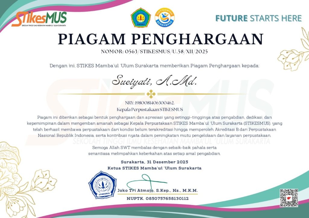 Surakarta — Sekolah Tinggi Ilmu Kesehatan Mamba’ul ‘Ulum Surakarta (STIKESMUS) memberikan Piagam Penghargaan kepada Kepala Perpustakaan STIKESMUS, Suciyati, A.Md., sebagai bentuk apresiasi atas dedikasi, pengabdian, dan kepemimpinan dalam mengembangkan perpustakaan hingga berhasil meraih Akreditasi B dari Perpustakaan Nasional Republik Indonesia.
