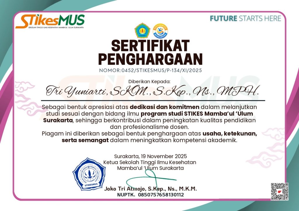 Sebagai bagian dari komitmen dalam meningkatkan mutu sumber daya manusia dan kualitas pendidikan tinggi, STIKES Mamba’ul ‘Ulum Surakarta (STIKESMUS) memberikan Piagam Penghargaan kepada dosen yang melaksanakan studi lanjut sesuai dengan bidang ilmu program studi. Pemberian penghargaan ini ditetapkan melalui Surat Keputusan Ketua STIKESMUS tertanggal 19 November 2025.