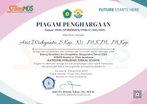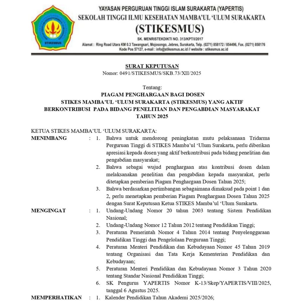 STIKES Mamba’ul ‘Ulum Surakarta (STIKESMUS) terus menunjukkan komitmennya dalam membangun budaya riset, publikasi ilmiah, dan pengabdian kepada masyarakat melalui pemberian Piagam Penghargaan kepada dosen yang aktif berkontribusi pada bidang penelitian dan pengabdian masyarakat Tahun 2025. Penghargaan ini ditetapkan melalui Surat Keputusan Ketua STIKESMUS Nomor 0491/STIKESMUS/SKB.73/XII/2025, tertanggal 3 Desember 2025.